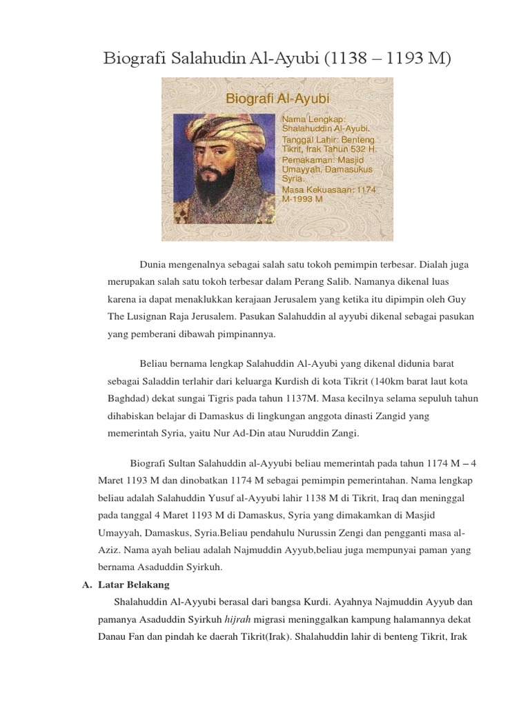 Skripsi yang berjudul Peran Shalahuddin al-Ayyubi Dalam Penyebaran Paham Ahlussunnah Wal Jamaah 566 - 589 H 1170 - 1193 M adapun masalah. Beliau adalah panglima tentera pemimpin dan pentadbir negara yang sangat berbakat dan sangat popular ketika zaman perang salib. PDF Download - Salahuddin Al-Ayyubi.